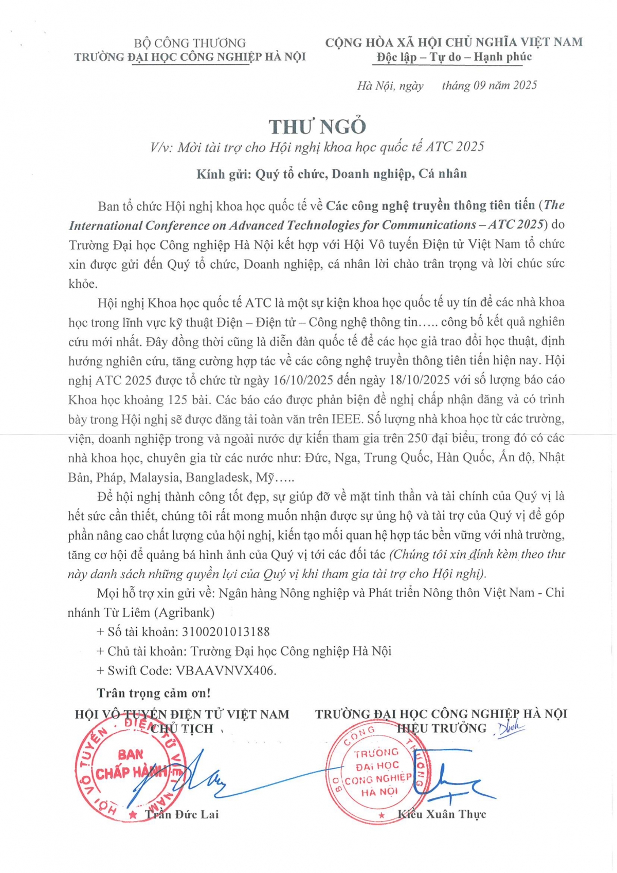 Thư mời tài trợ Hội nghị Quốc tế về các công nghệ Tiên tiến cho Truyền thông (ATC 2025)